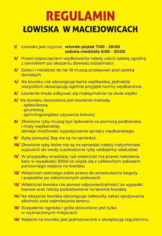 Na łowisku komercyjnym w Maciejowicach do dyspozycji wędkarzy są dwa stawy o łącznej powierzchni ok. 1 ha oraz głębokości do 2 m. Cały teren łowiska jest ogrodzony. Zarybienie stawów 1,5 tony (karpie do 15 kg, szczupaki, jesiotry, liny, amury, tołpygi). Malownicza okolica sprawi, że zapamiętasz to miejsce na zawsze i będziesz tu często powracał. Idealny akwen dla rodzin i zapalonych grup wędkarzy. Istnieje możliwość zakupu ryb na miejscu.